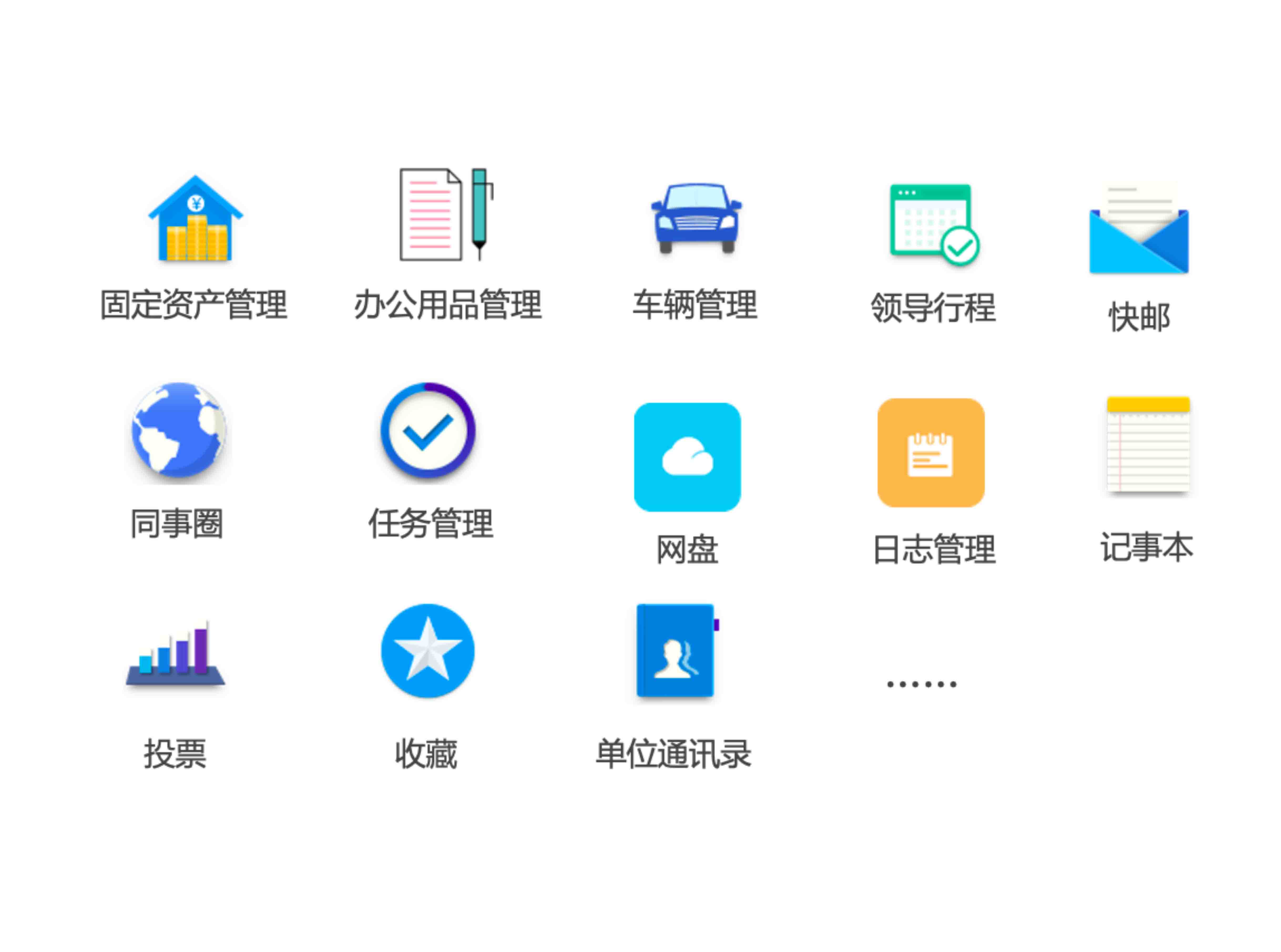 涵盖事务督办、公文、内容、会议、知识、车辆、日程、内容、审批管理等办公场景