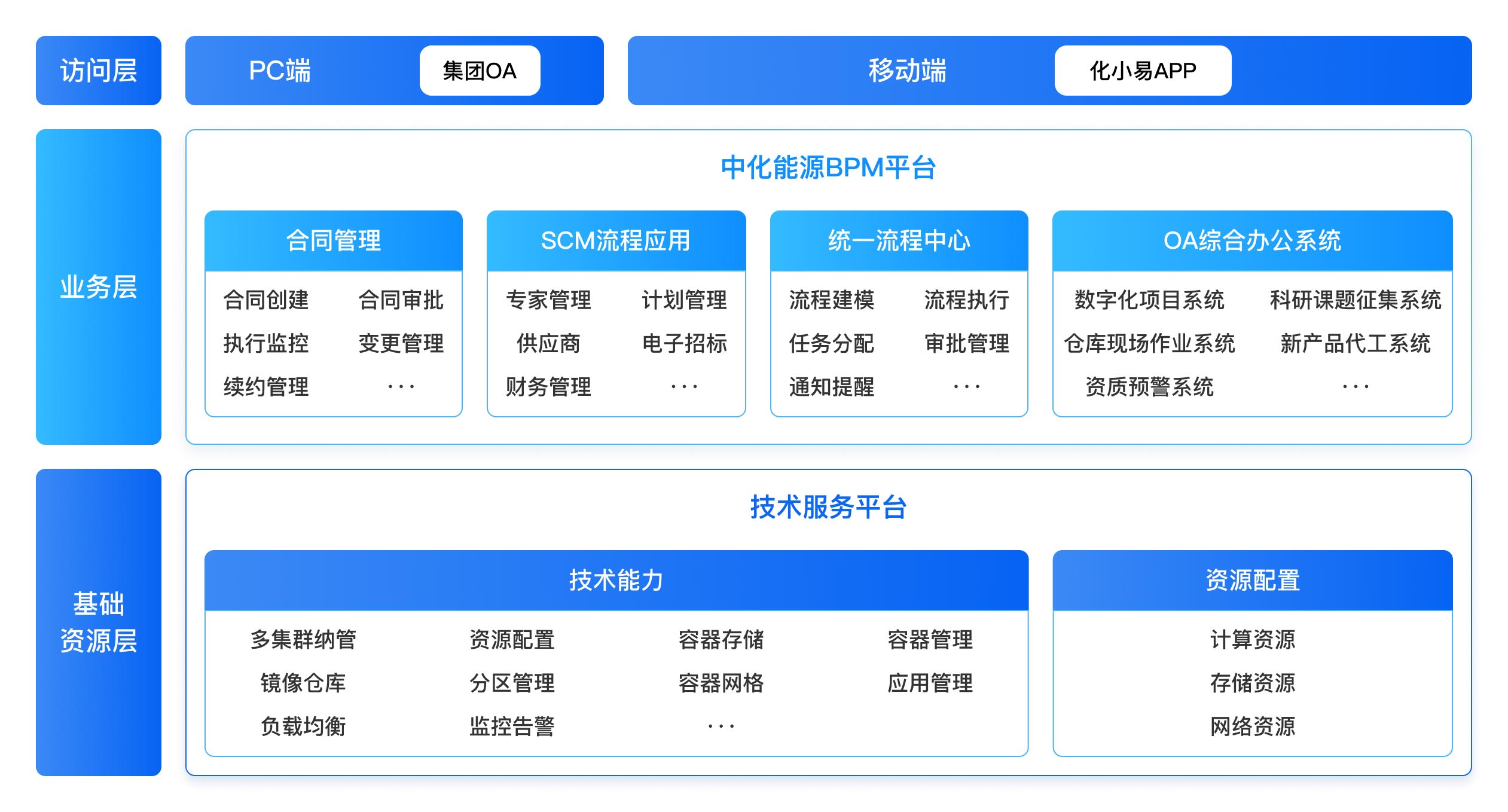 中化能源数智化建设项目依托炎黄盈动AWS PaaS平台,为集团3万用户提供统一应用服务和标准化技术支持。以“三统一、一开放”为核心目标,即统一流程标准、统一数据服务、统一应用入口、开放生态集成。构建了涵盖合同管理、SCM流程、OA办公及统一流程管理于一体的智能化业务平台。通过数智技术赋能企业供应链、生产运营与管理决策全流程,推动业务流程标准化、自动化与智能化升级。