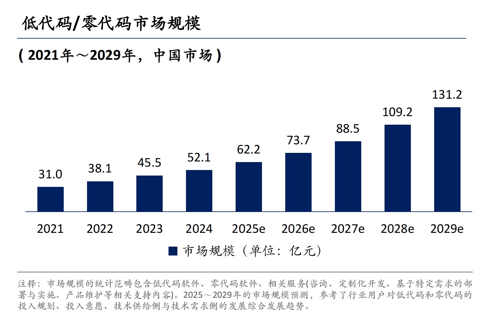 报告指出,中国低代码市场正保持稳健增长态势,2024年中国低代码/零代码市场规模达52.1亿元,预计2029年市场规模将突破131亿元,该技术已成为企业数字化转型的“关键生产力”。