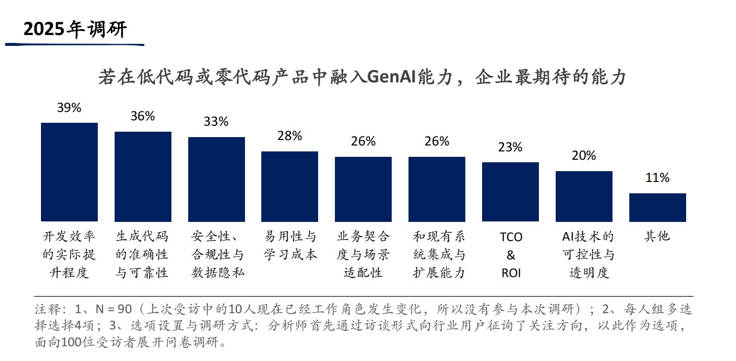 当前,一个显著的拐点已经出现:生成式AI与低代码的深度融合,正成为市场主流。企业不再满足于简单的“拖拉拽”,而是期待AI能带来开发效能的“实质性飞跃”——能否嵌入复杂业务场景并应对灵活多变的创新需求?生成代码准确性和可靠性能否提升?安全、合规性与数据隐私能否得到保障?...这已成为企业选型的关键标准。