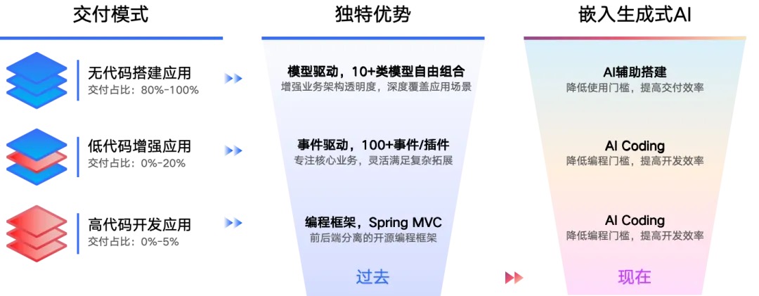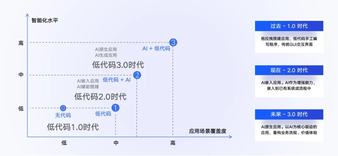 中国低代码市场已走过仅靠“拖拉拽”和手工编写代码来开发应用、提升效率的1.0阶段,迈入了由人主要驱动,AI作为副驾驶的低代码2.0时代。炎黄盈动AWS PaaS平台将生成式AI能力深度嵌入到平台各个环节,进化出AI生成应用、AI辅助搭建、业务智能助理等核心能力,将开发周期从数周缩短至分钟级,让开发者与业务人员都能成为应用构建的“主角”。炎黄盈动认为:开发范式将朝着AI自主性更强、业务耦合更深的方向持续演进,低代码也将正式进入3.0时代。