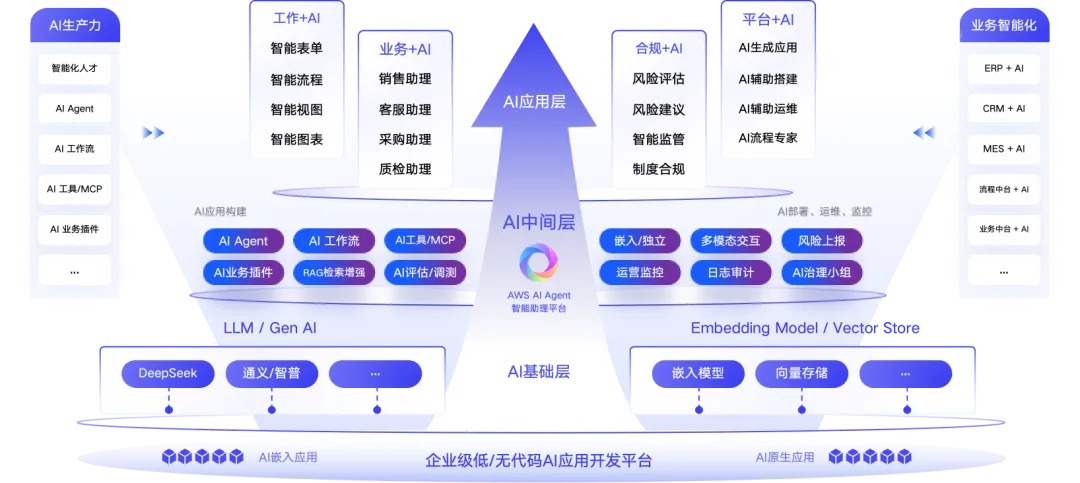 交付层面,AWS aPaaS低代码平台可通过不同的交付模式,满足从无代码快速搭建到高代码专业开发的全方位需求。其AI辅助功能贯穿表单、流程、图表、视图等核心模型,帮助用户在组件构建自动化、业务-开发协同、多端一致性保障等多个维度实现交付效率提升。通过嵌入生成式AI,使低代码平台的交付能力更贴近业务节奏,适应持续变化的业务需求。