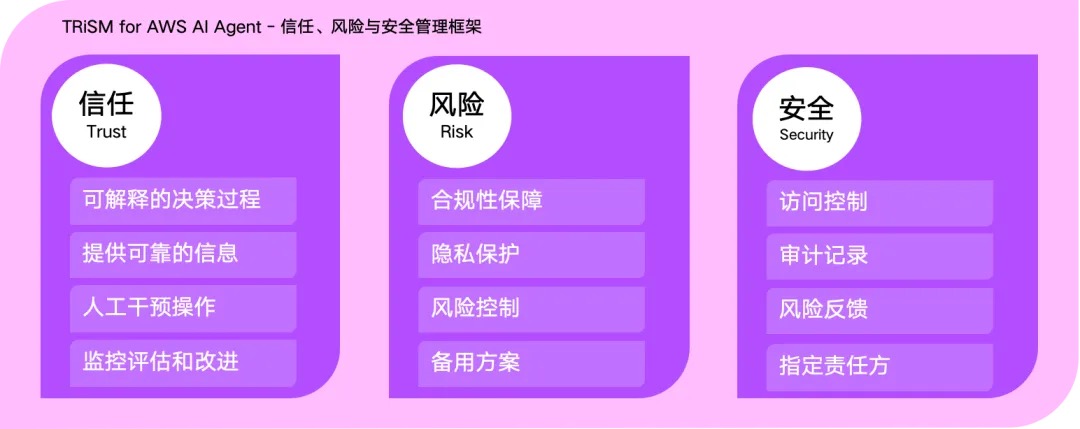针对企业关心的数据隐私及安全合规问题,炎黄盈动AWS AI Agent平台参考Gartner提出的AI TRiSM框架推出「TRiSM for AWS Agent」(信任、风险和安全管理框架)AI TRiSM框架,最大程度上确保上层应用的合规、公平、可靠和保护数据隐私。
