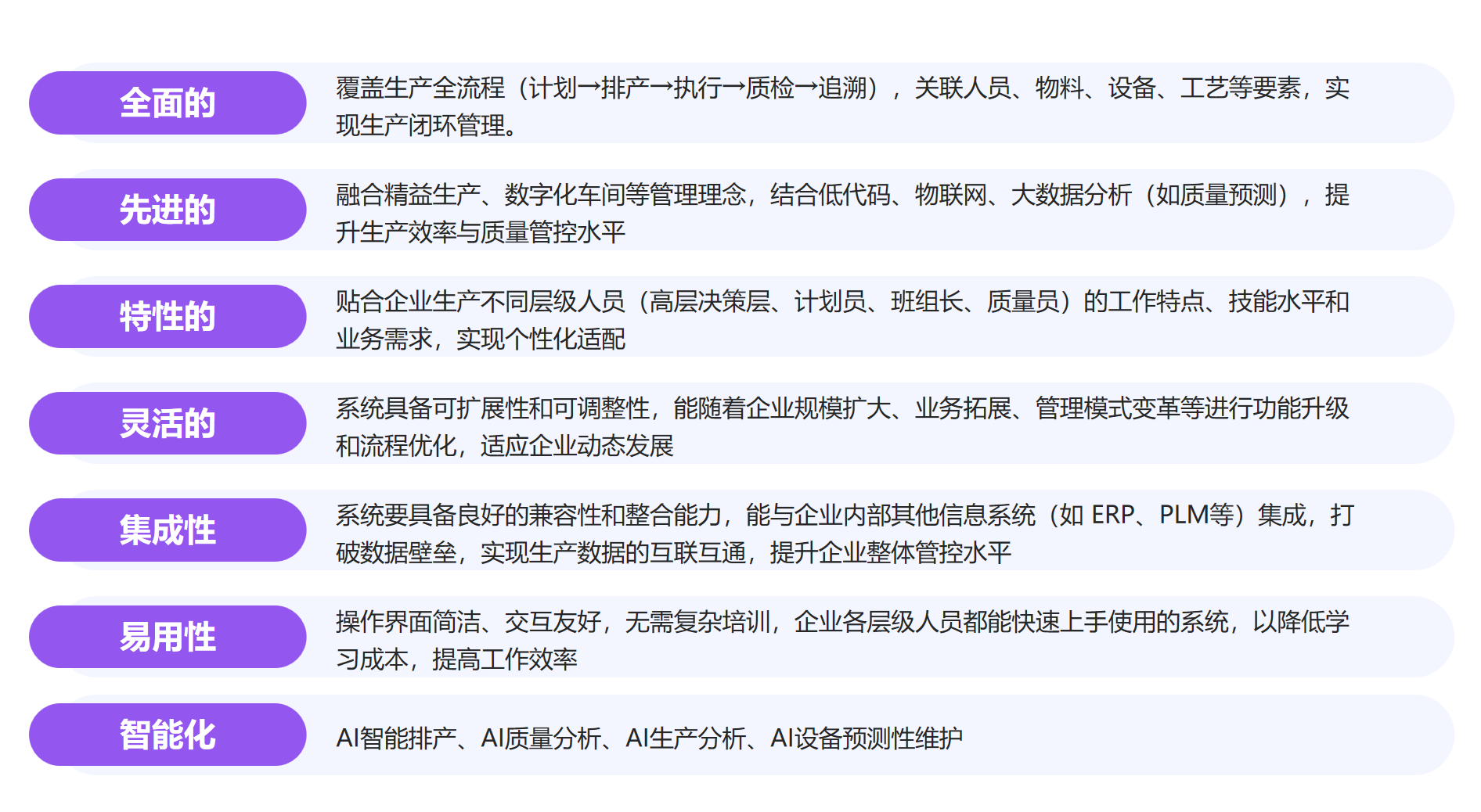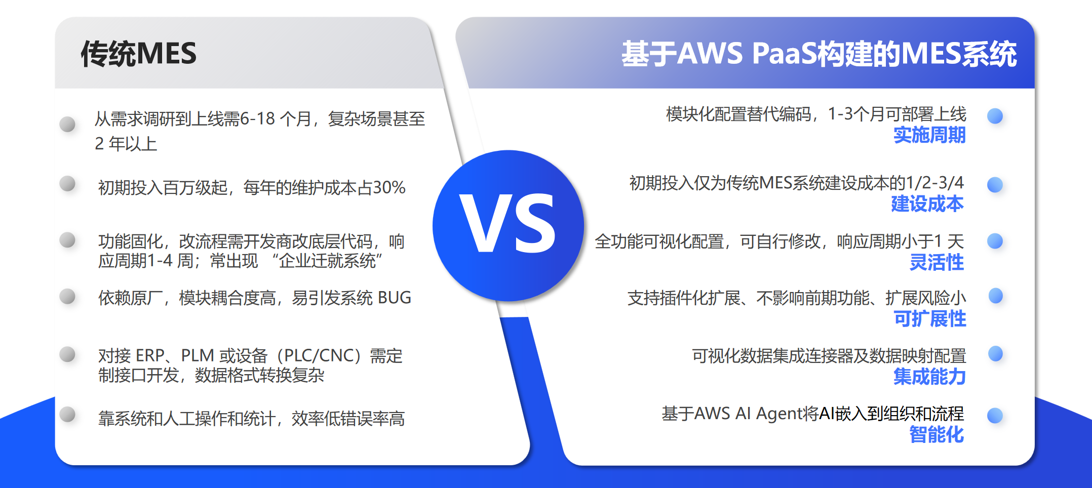 得益于炎黄盈动AWS PaaS平台所涵盖的aPaaS低代码、bpmPaaS智能流程、iPaaS智能集成、AI Agent智能助理四大产品组件。AWS PaaS柔性MES系统,从实施周期、建设成本、灵活性、可扩展性、集成能力和智能化等方面,相比于传统MES均表现卓越。当传统MES还在着重于“流程标准化”时,柔性MES已通过流程智能化、数据实时化、决策智能化,重塑了人/机/料/法/环/测整个生产价值链。