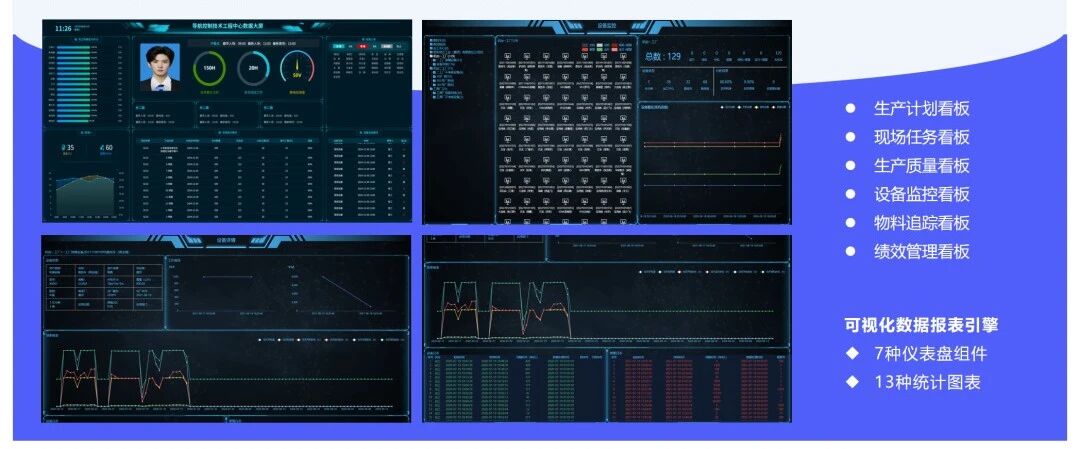 在决策支持方面,通过低/无代码即可快速搭建各类所需的报表和图表。以生产车间大屏为例,通过对人员、环境、设备计划等信息的实时同步,让管理者直观掌握生产状态、任务目标,为生产计划调整、资源分配等决策提供数据依据,助力企业合理利用资源提升产能。