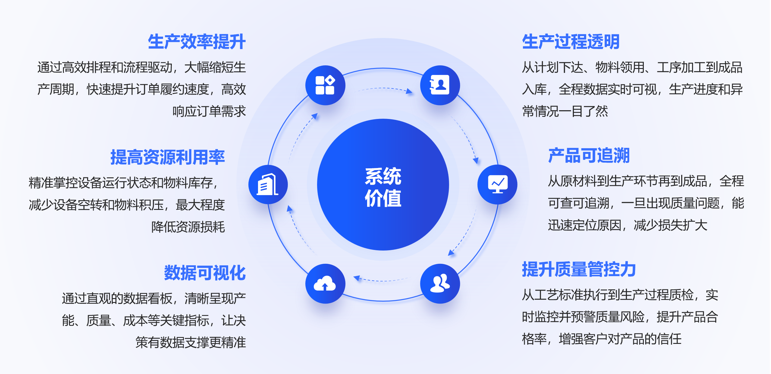 启用炎黄盈动MES系统以来,已实现物料档案、产品BOM、工艺路线、生产计划、生产执行、质量控制等核心业务环节的全流程可视化管控。通过与ERP、进销存系统深度集成,打通订单到交付的全链路数据。实时采集设备状态、工艺参数等生产数据,动态优化生产排程与资源调度,显著提升了生产效率和产品质量稳定性,有效降低了生产损耗和管理成本。从而为企业构建起敏捷透明、智能高效的生产管理系统。