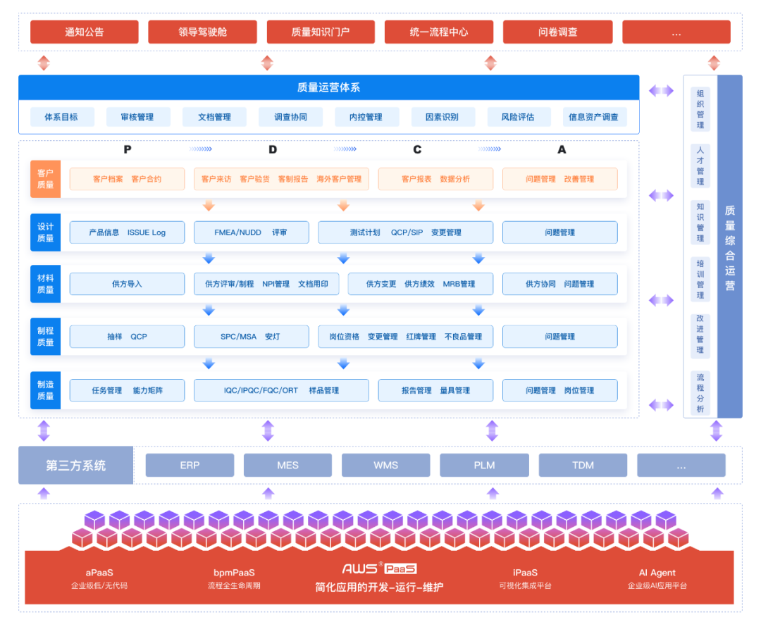 依托AWS PaaS平台的低代码与BPM能力,横向打通研发、供方、生产、质检、销售等环节,确保信息实时共享与高效协同;纵向贯通集团、事业部/工厂至供应商的质量信息链,实现生产规范化与过程可视化。