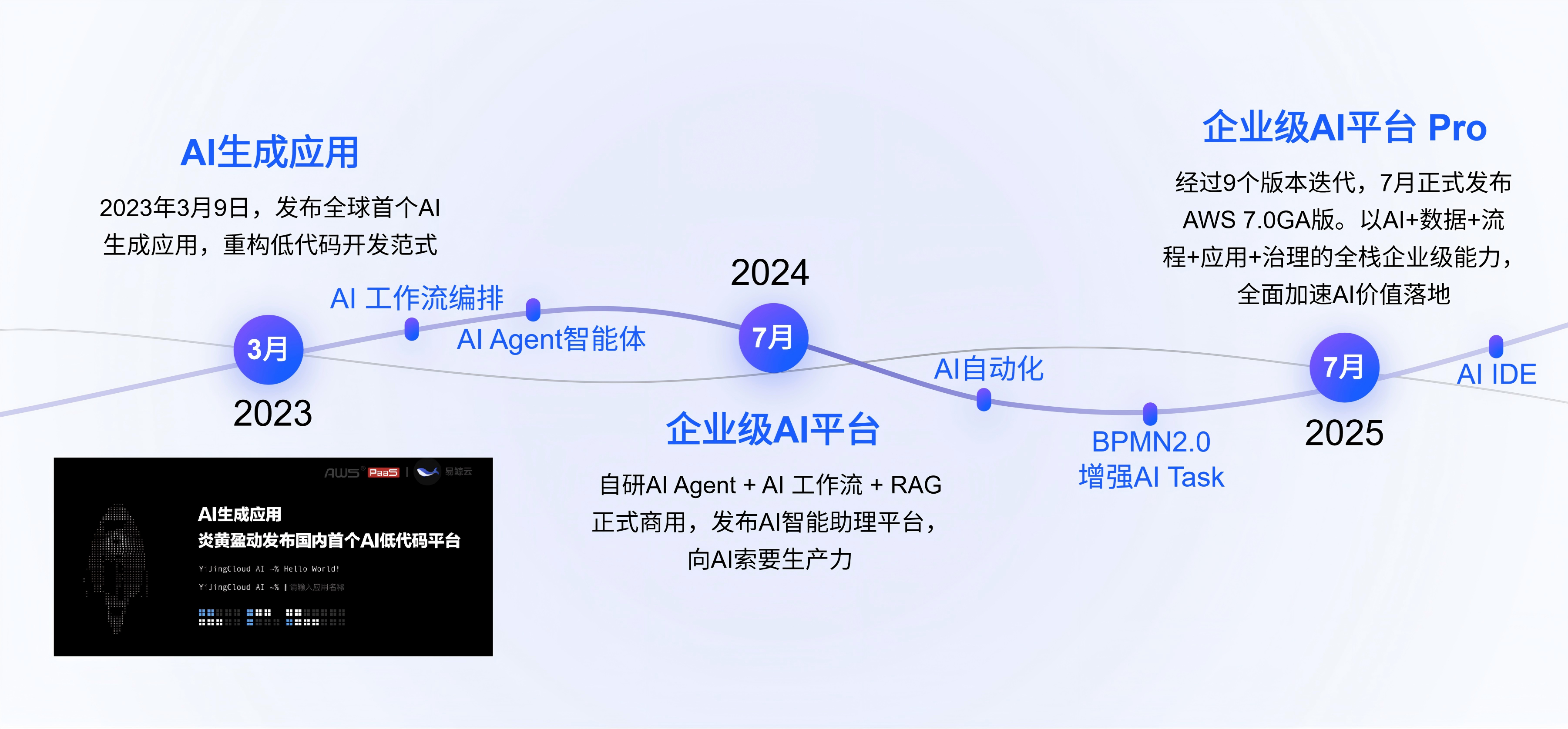 在技术层面,炎黄盈动以AI Agent原生应用架构为核心,实现了低代码与 AI 的深度融合,其发展历程历经三大里程碑:2023年3月发布全球首个AI生成应用,实现从“AI增强开发”到“AI生成应用”的范式跃迁;2024年7月发布企业级AI平台,集成自研 AI Agent、AI工作流与RAG,进入“智能应用运行”深水区;2025年7月发布AWS 7.0GA,实现“AI+数据+流程+应用+治理”的全栈能力整合与闭环。